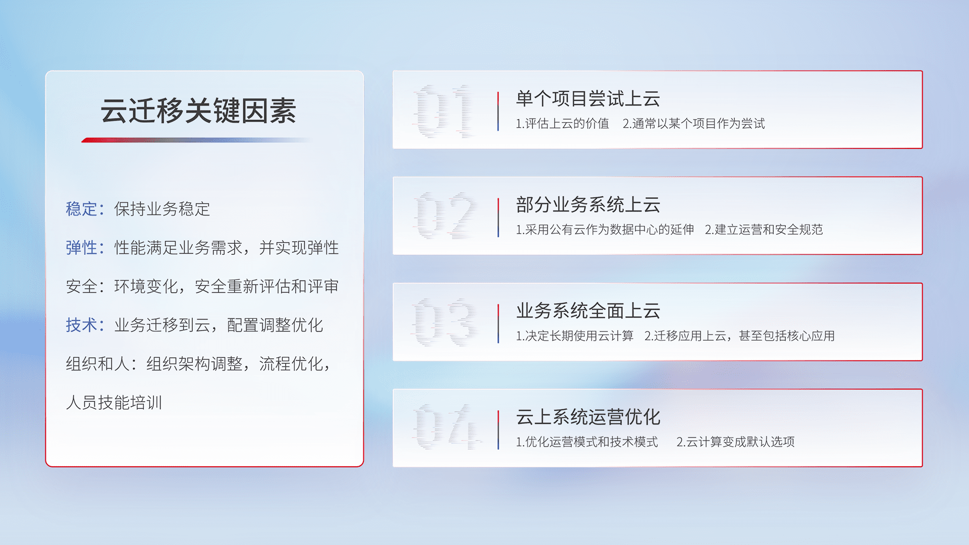 结合实际业务,,,,从规划设计、、云平台选型、、、、云原生改造、、、数据迁移、、、集成交付,,,迁移全过程为客户识别最佳上云路径,,,做好风险识别管理,,,设计网络架构、、、身份权限、、安全审计合规、、、操作审计、、、日志审计、、、监控告警策略、、多站点容灾设计等,,对云上基础设施进行整体规划,,提升IT治理水平,,,以满足弹性、、、高可用、、、、高性能的需求。。