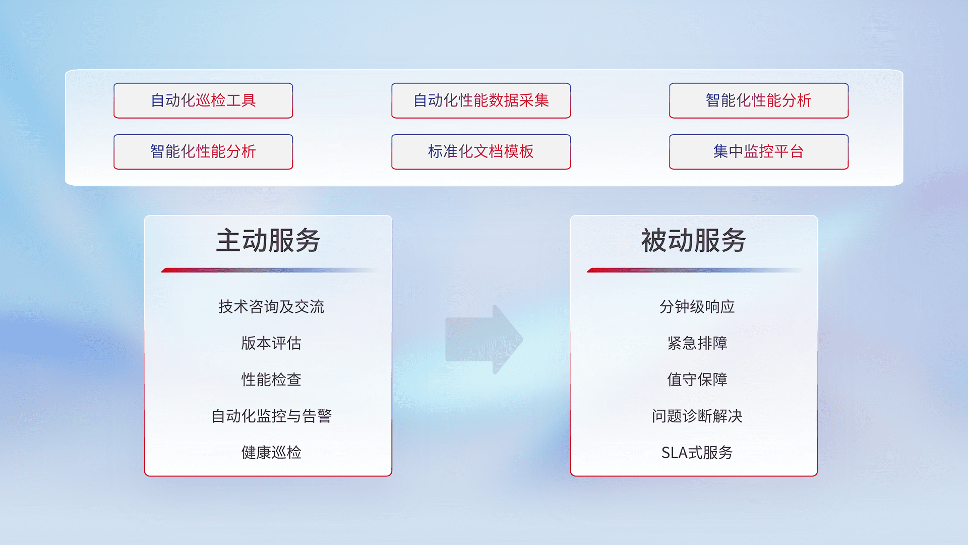 智能化工具和标准化文档,,,保障服务质量,,,,提供主动服务(包含技术咨询、、版本评估、、性能检查、、自动化监控与告警、、、健康巡检)和被动服务包含(分钟级响应、、、紧急排障、、、值守保障、、、问题诊断解决、、、SLA服务)。。
